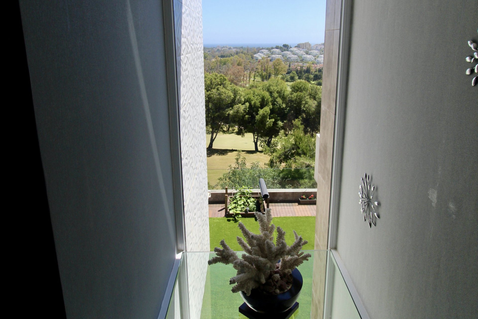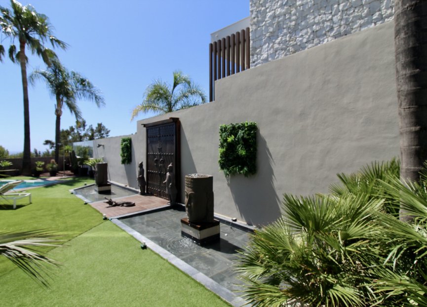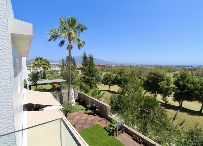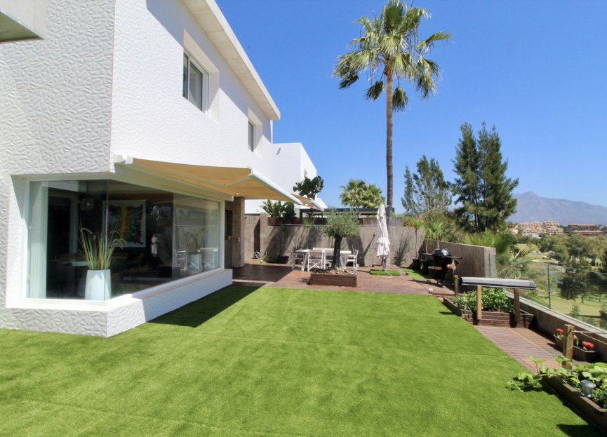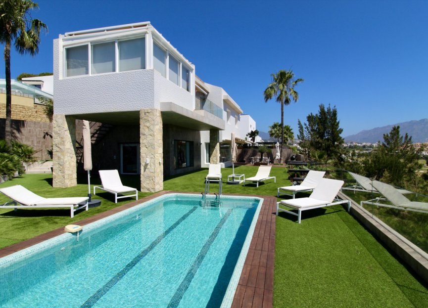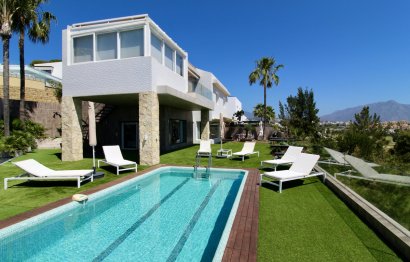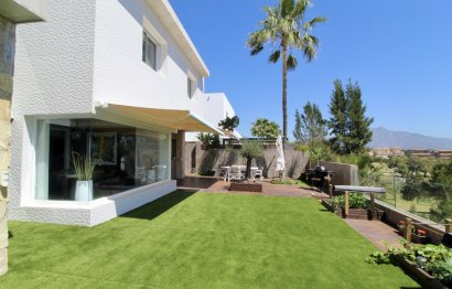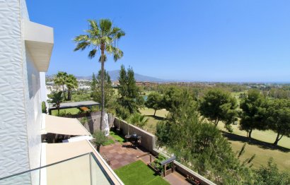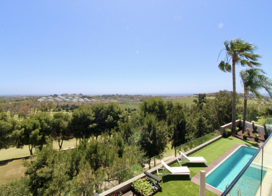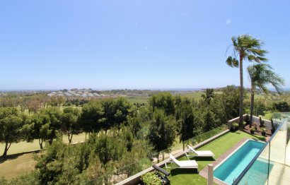 Villa de estilo mediterraneo en primera linea de golf en Marbella / Benahavis con fantasticas vistas al mar y a Gibraltar. 626m2 de parcela a un nivel, esplendido jardin, piscina privada y jacuzzi extrior. Desde la entrada principal con puertas de madera, se llega a un elegante salon con chimenea y comedor separado, ambos con accesso a la terraza cubierta. La amplia y moderna cocina tiene espacio para una zona de desayuno. En la primera planta está el dormitorio principal con accesso a la gran terraza de donde hay unas vistas maravillosas. Hay dos dormitorios mas en la misma planta. Hay tambien un apartamento con entrada propia. Hay suelo de madera en la primera planta, lo demas hay suelo marmol, suelo radiante en los cuartos de baños. Hay un aparcamiento cubierto para 2 coches. Villa en venta en Benahavis - Costa del Sol - Andalucia - España.