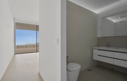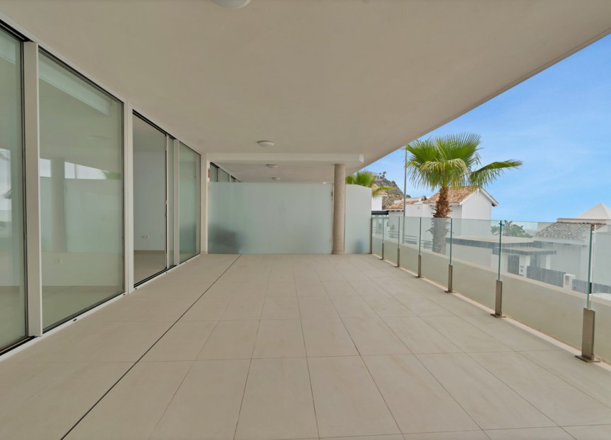 La gran terraza en forma de L que rodea el apartamento proporciona impresionantes vistas panorámicas al mar y un amplio espacio para relajarse y comer al aire libre.