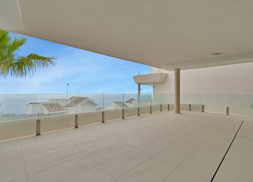 La gran terraza en forma de L que rodea el apartamento proporciona impresionantes vistas panorámicas al mar y un amplio espacio para relajarse y comer al aire libre.