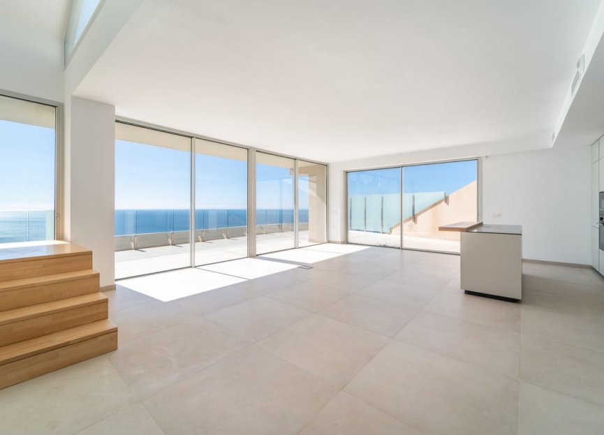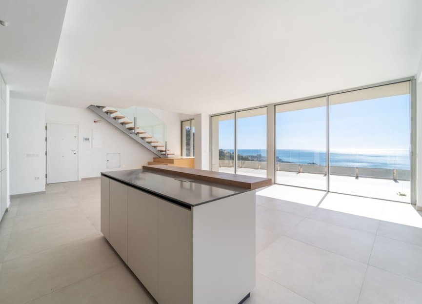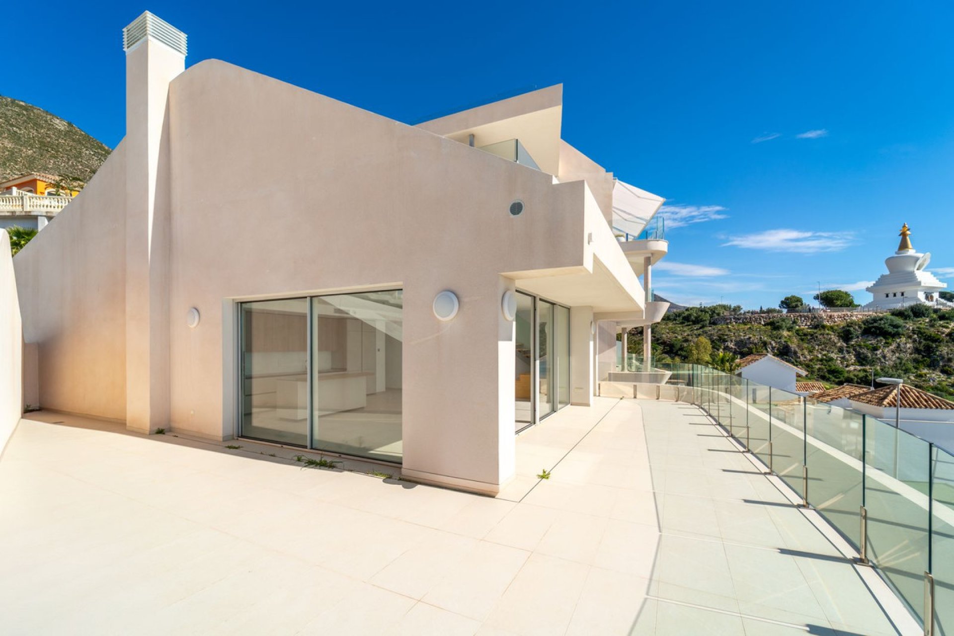 Ático duplex a estrenar con orientación sur, ubicado en la exclusiva urbanización Stupa Hills. Consta de hall, tres dormitorios con armarios empotrados, persianas eléctricas, baño completo y aseo, cocina abierta totalmente amueblada y equipada con electrodomésticos de Siemens. Amplio salón-comedor con acceso a una terraza de 65m2 con vistas panorámicas al mar, la bahía de Fuengirola y al Stupa. En la segunda planta se encuentra el dormitorio principal, vestidor, baño ensuite y zona de lavadero. El dormitorio da salida a una terraza de 21m2 con vistas al mar panorámicas. Aire acondicionado frío y calor por Airzone, vídeo portero, sistema domótico, preinstalación de alarma. Incluye dos plazas de aparcamiento y un trastero.