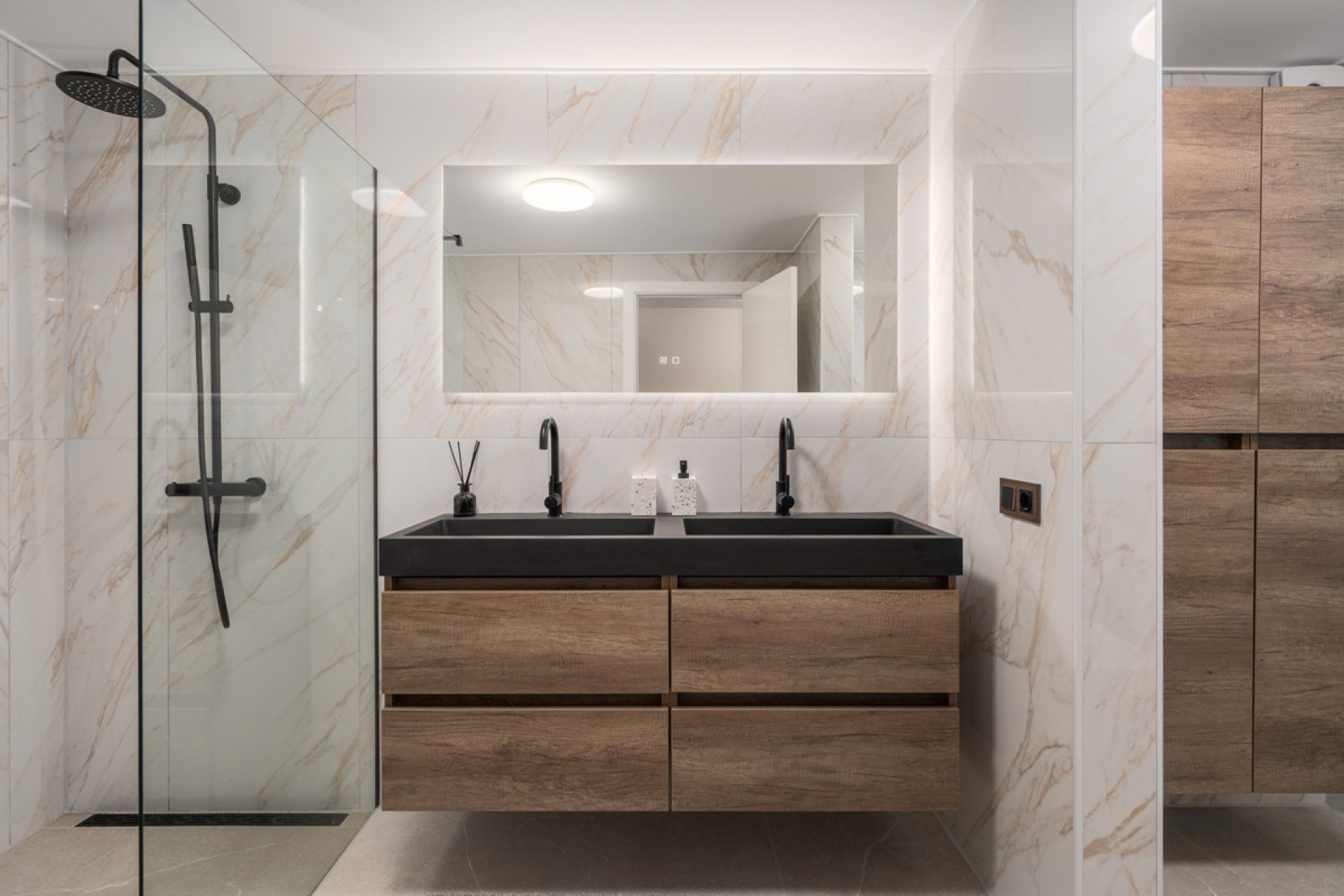 La terraza orientada al sur de 19 m² se conecta perfectamente con la piscina privada, creando un espacio ideal para relajarse al aire libre, cenar o recibir invitados. Su orientación garantiza abundante luz natural y vistas tranquilas al área de la piscina, mientras que el diseño de planta abierta de las zonas comunes mejora la conexión entre interior y exterior.