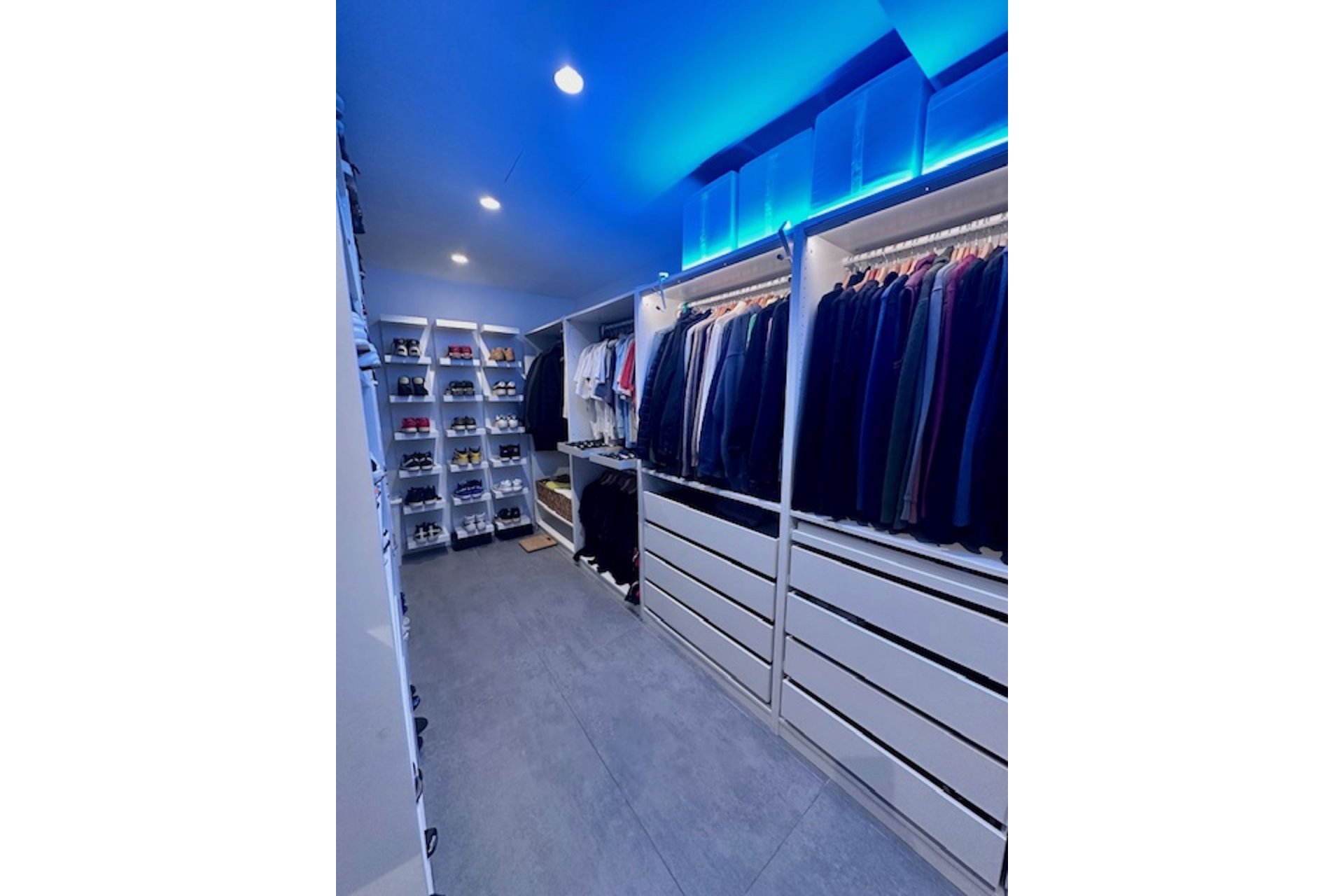 Un enorme vestidor bien dividido, con luces y fabricado a medida.