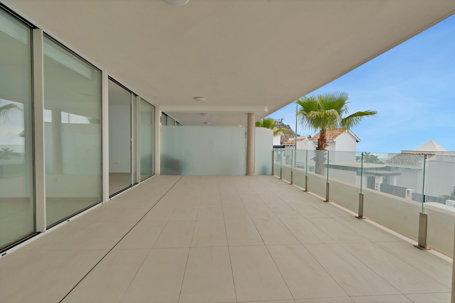 The property features a bright and spacious living/dining area with large windows and access to a vast, serene terrace. The living area offers beautiful sea views from the inside. The large L-shaped terrace surrounding the apartment provides stunning panoramic sea views and generous space for relaxing and outdoor dining.