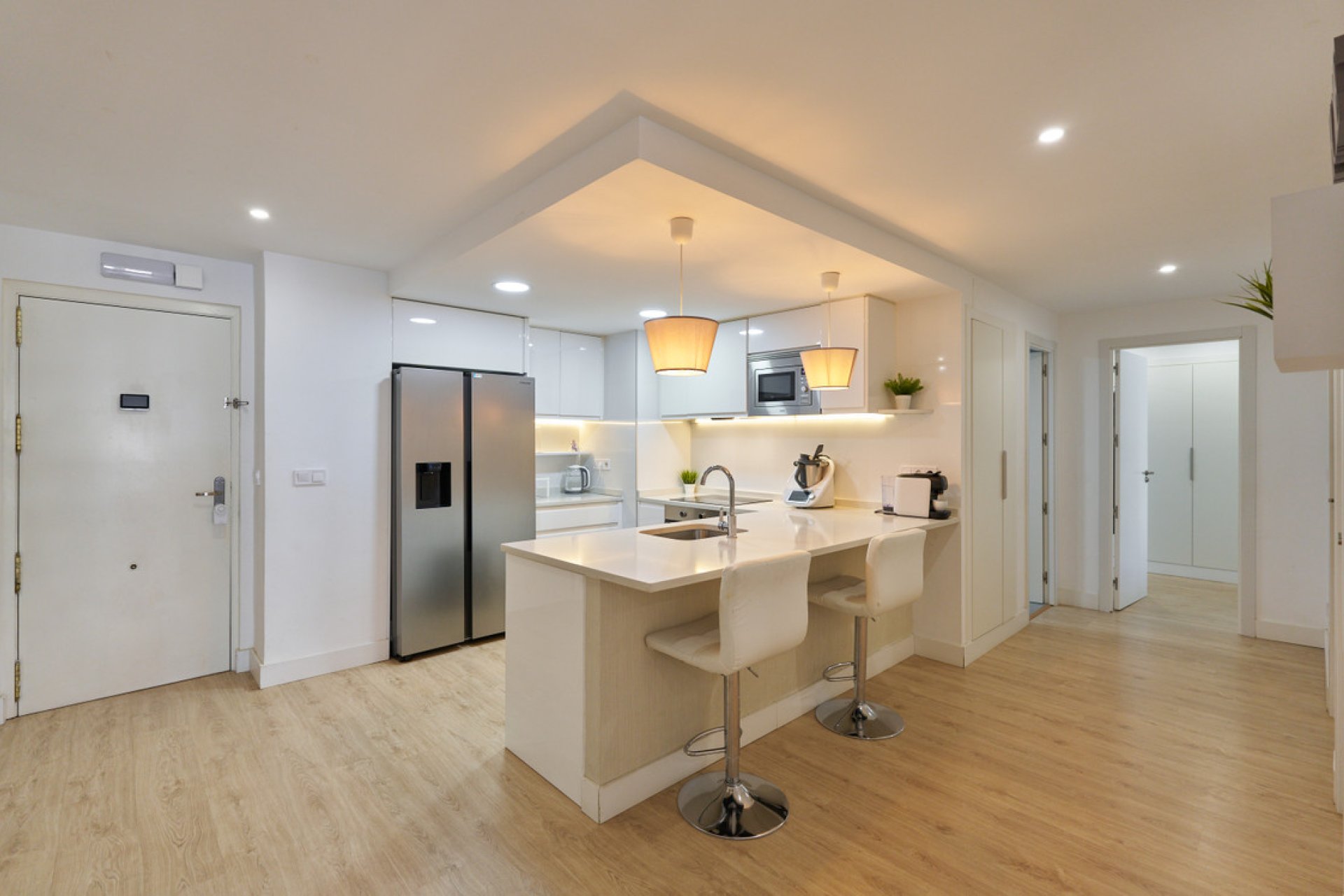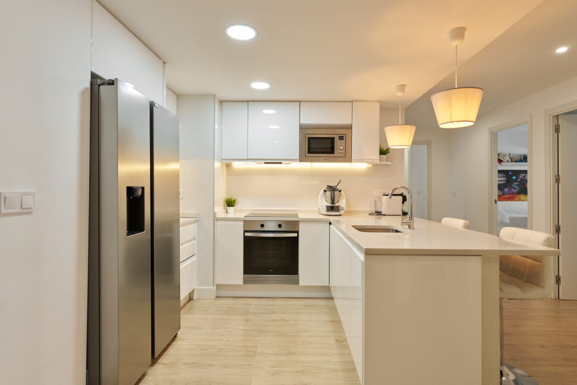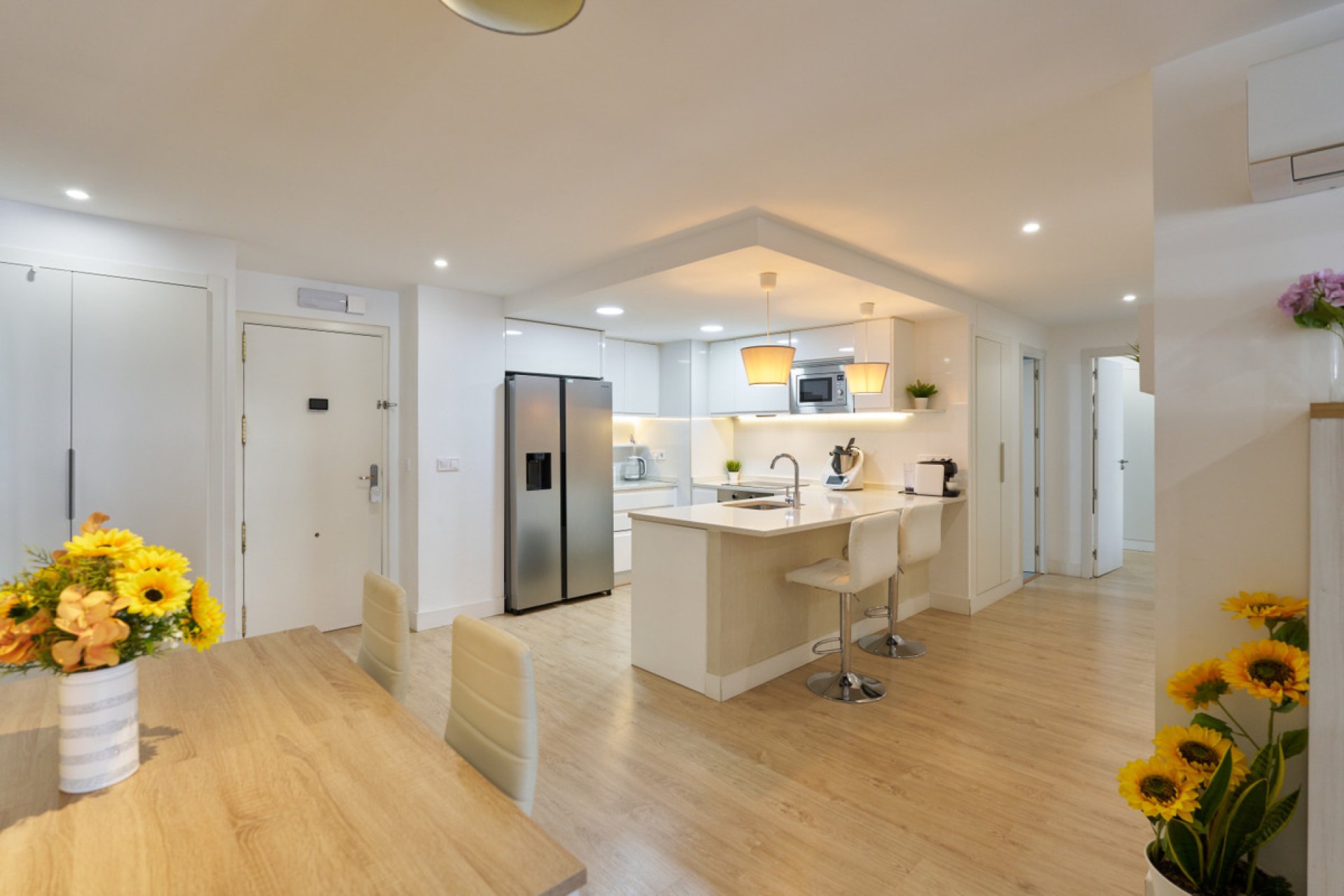 With 146 m² of space, the apartment features three bedrooms and two modern bathrooms, one of which is en suite. Every corner has been crafted with high-quality finishes, and the warm, intelligent lighting creates a cozy ambience, highlighting the beauty of the wooden floors that flow throughout the home. Every detail has been thoughtfully designed to create a stylish and functional retreat.