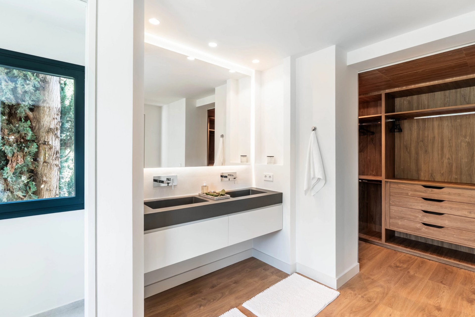 Upstairs, the property features three additional spacious bedrooms, each designed with comfort and tranquility in mind. Every room includes a private en-suite bathroom finished to a high standard. The principal suite is a true retreat, offering a generous layout, a walk-in wardrobe, and a large private terrace with breathtaking panoramic sea views.
