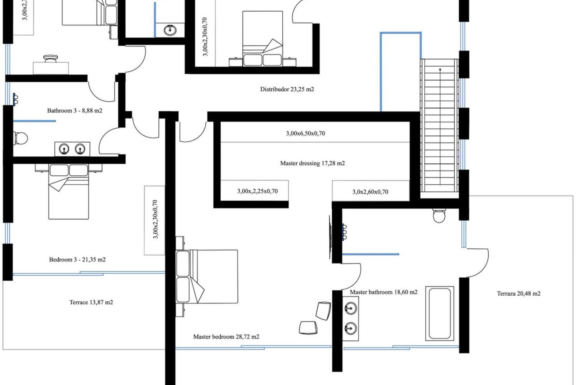Consisting out of; ground floor, entrance hall, guest toilet, open plan living/dining area with a fully fitted kitchen, master bedroom with ensuite bathroom and dressing, covered carport for 3 car, 2 further bedrooms each with their ensuite bathroom.