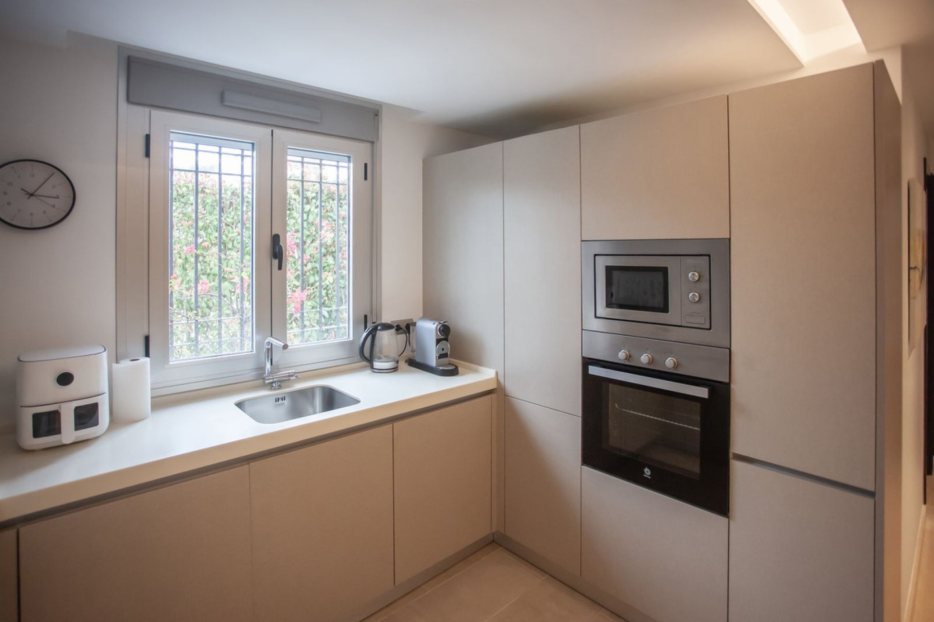 The fully equipped kitchen and spacious living areas with fitted wardrobes are complemented by numerous amenities, including air conditioning for year-round comfort and a covered, secluded terrace.