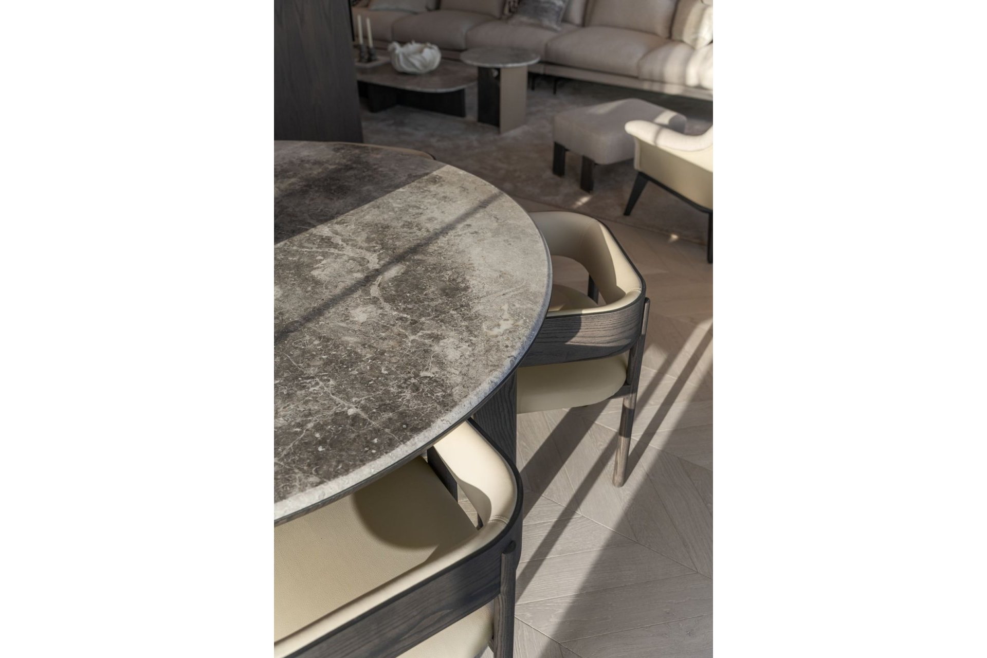 The bespoke kitchen, crafted with premium materials, is fitted with state-of-the-art Gaggenau appliances, offering both functionality and sleek aesthetics. The open-plan layout flows effortlessly into the dining and living areas, creating a bright and welcoming ambiance. Natural oak wooden flooring runs throughout the property, complemented by high-end furnishings by Alexandra Collection and custom-designed finishes, including elegant Gessi taps and fixtures.