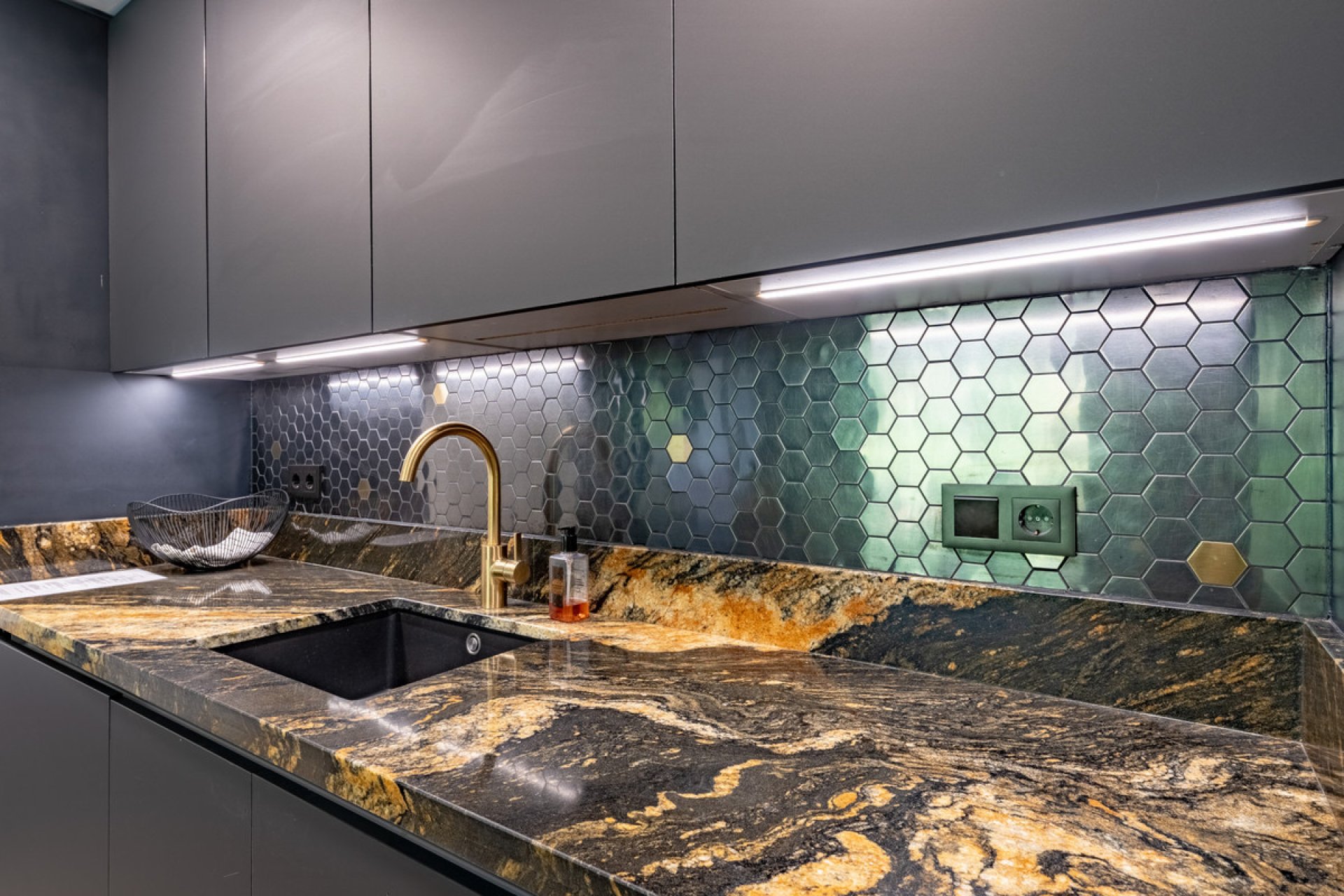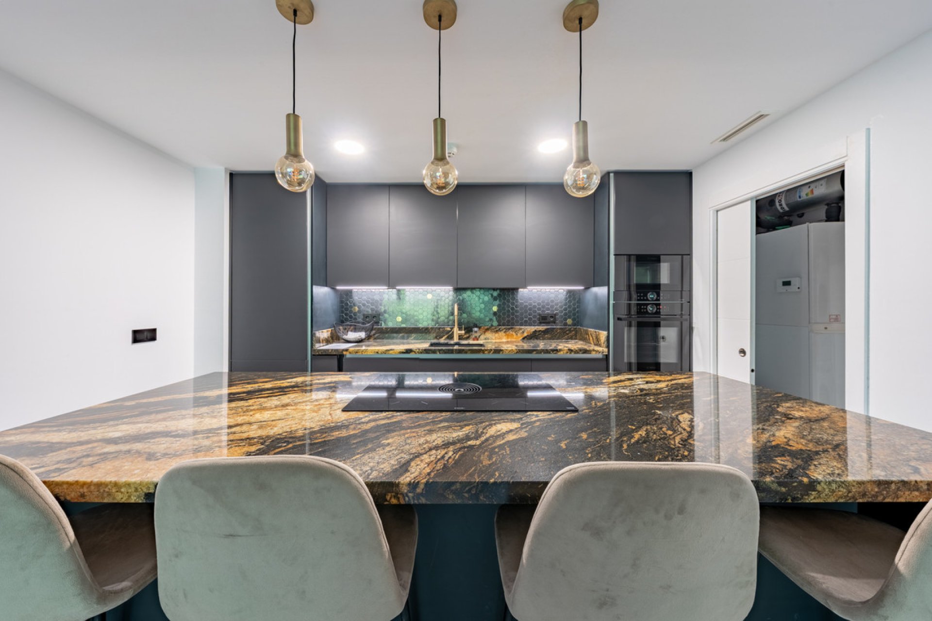 With 100 m² of interior space, it features 3 spacious bedrooms, 2 fully upgraded bathrooms with premium finishes, and a 40 m² sun-drenched terrace boasting panoramic views of the golf course and surrounding mountains. Every detail has been carefully selected, including a designer kitchen equipped with Bosch appliances, a BORA hob with integrated extractor, and a high-end countertop. The living room is elegantly finished with Cavalli wallpaper, enhancing the luxurious feel of the space.