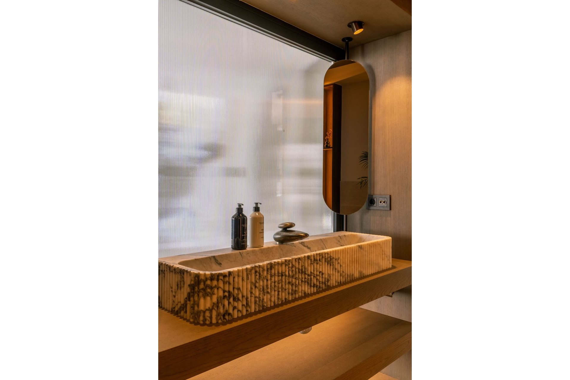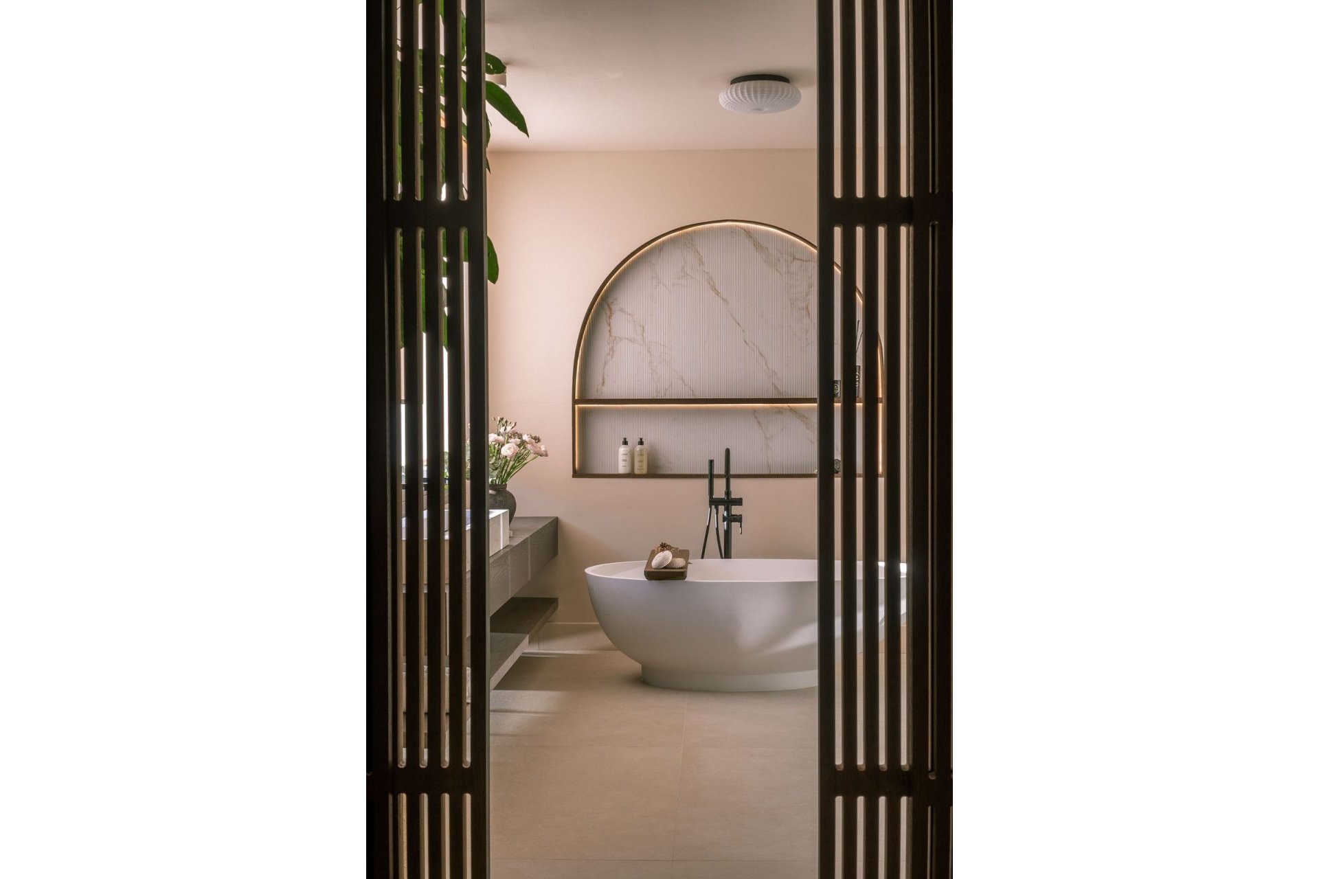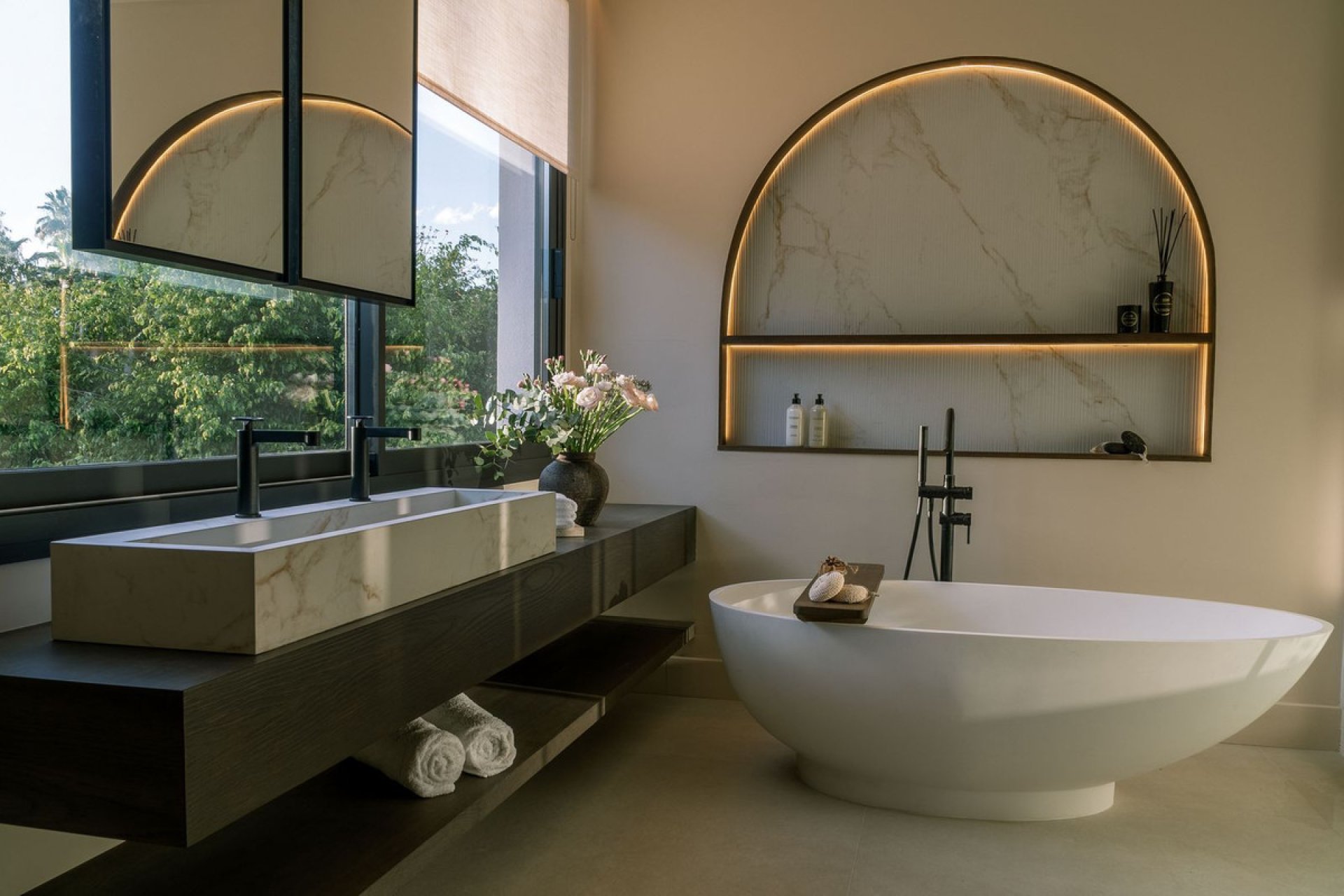 Inside, you'll find a harmonious use of natural materials and calming colors, creating an inviting atmosphere that promotes relaxation. The spacious layout features five beautifully designed bedrooms and six modern bathrooms, making it an ideal space for families and those who love to entertain.