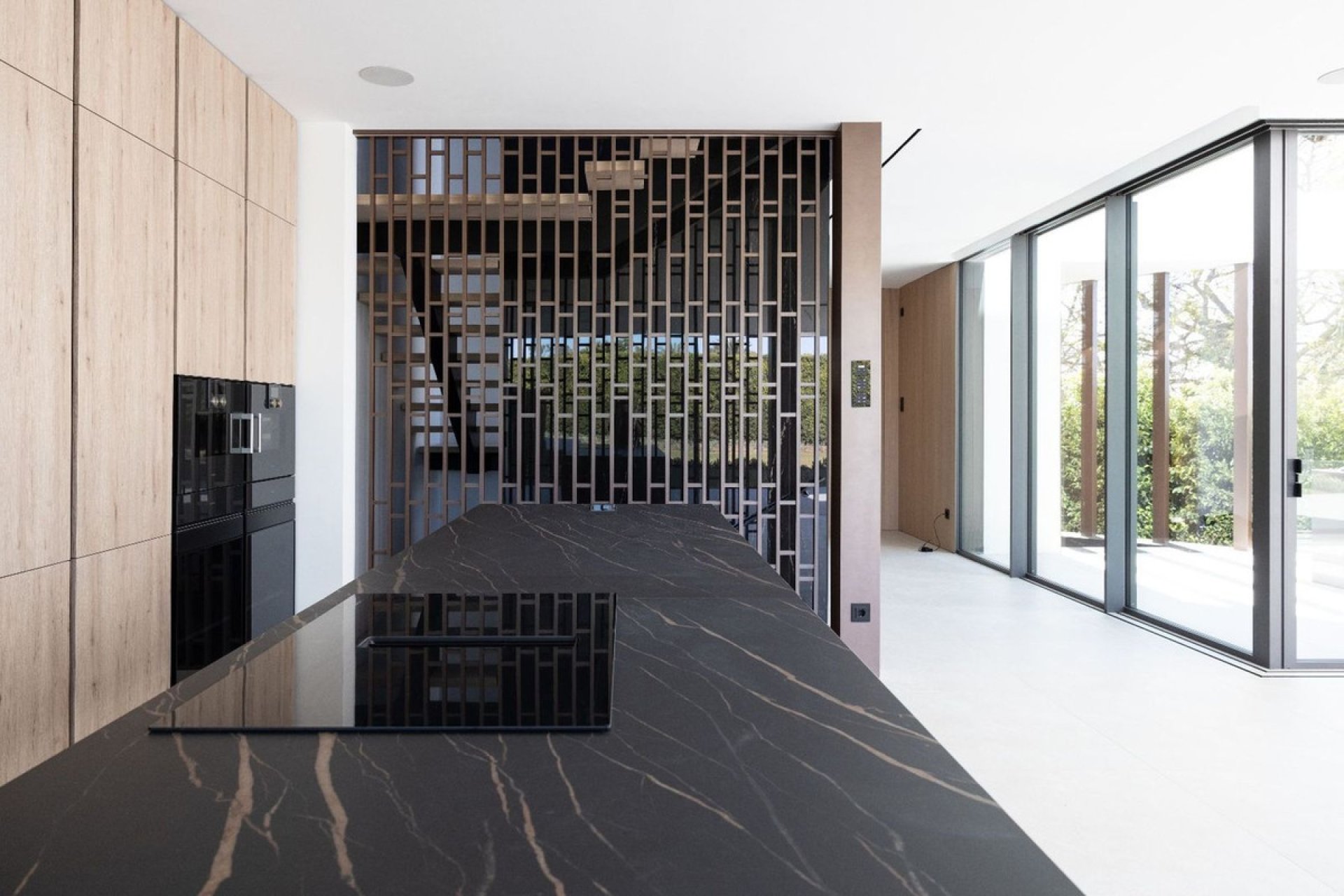 A sleek minimalist kitchen has integrated Gaggenau appliances. All 4 levels are connected by a modern elevator.
