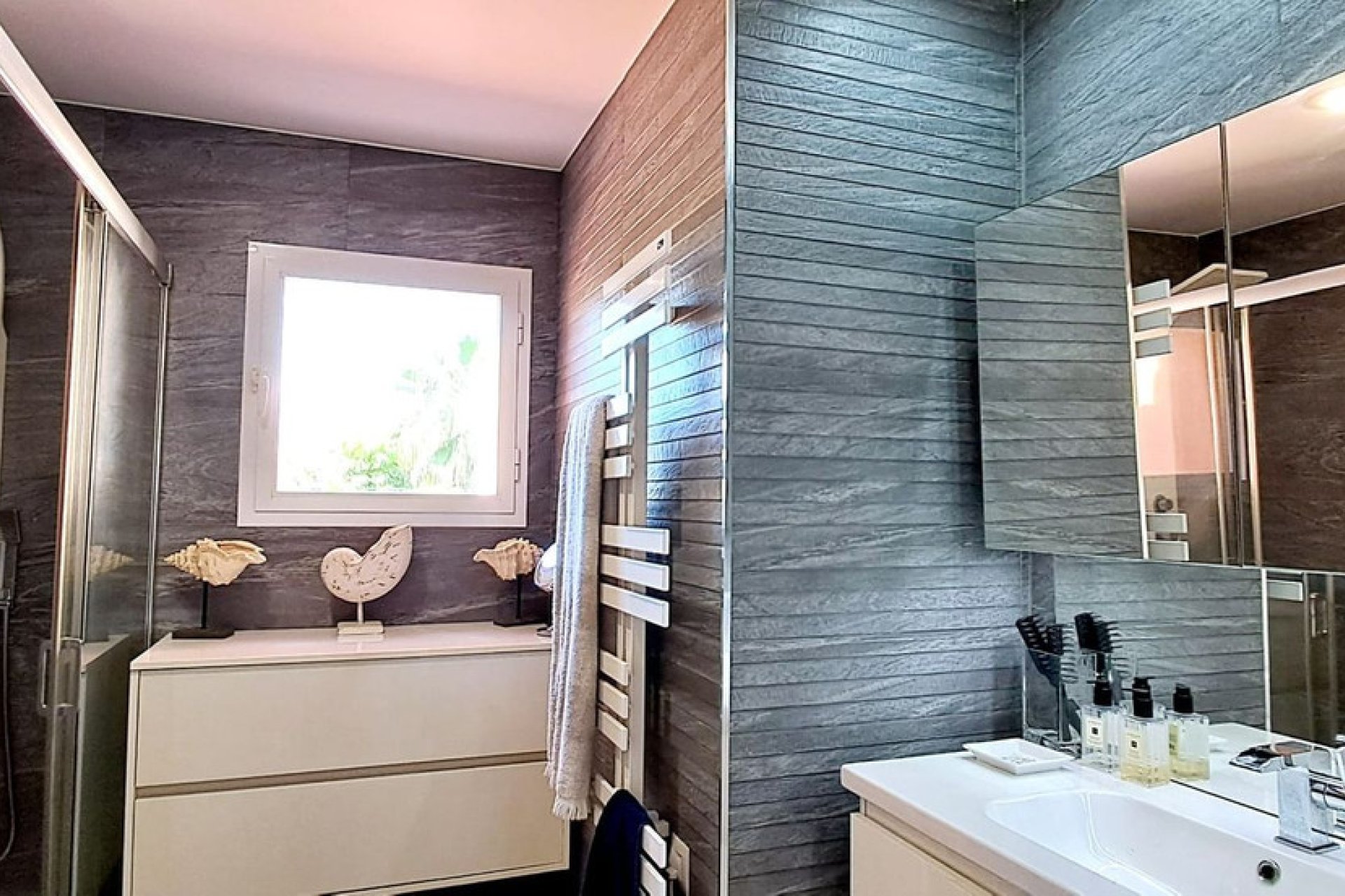 By entering the main level you find the south facing living/ dining area leading out to one of the four terraces, a modern & well equipped brand new kitchen, two bedrooms sharing the renovated modern shower room and as well a guest toilet.