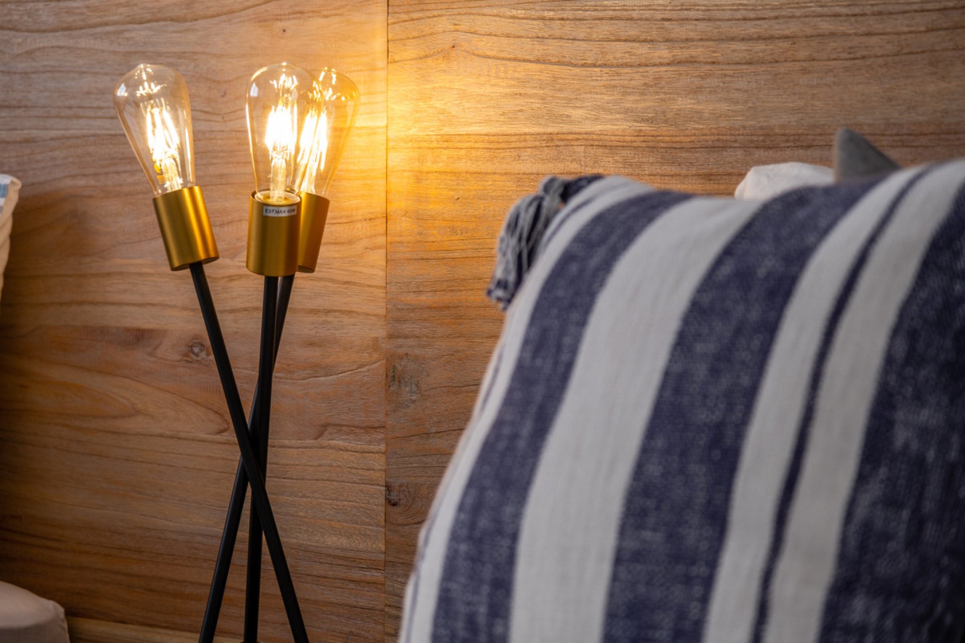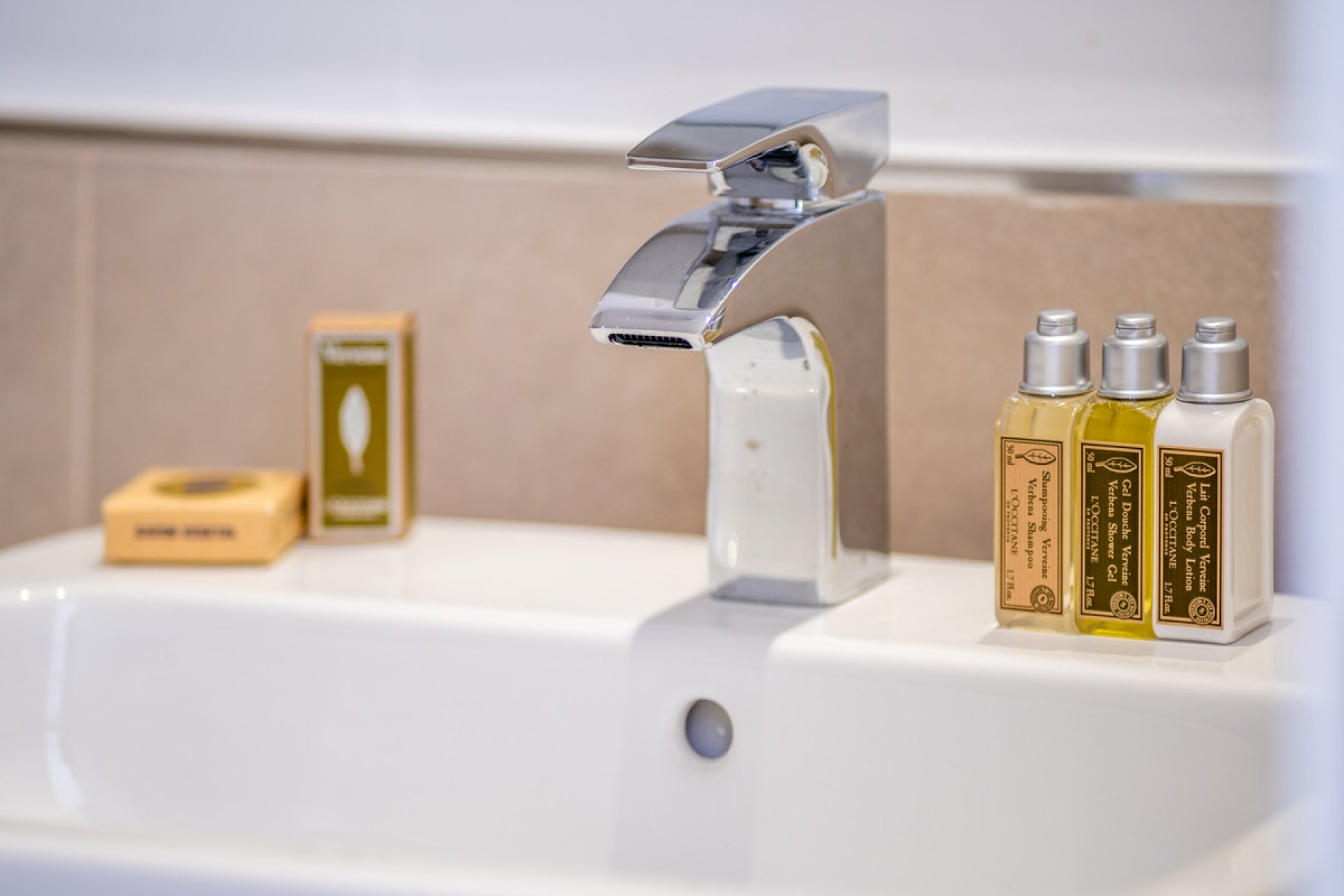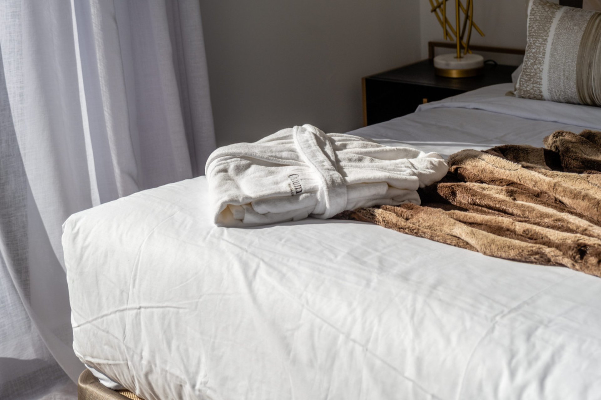 Designer flooring: warm walnut in the bedrooms, elegant beige tile in the living areas.