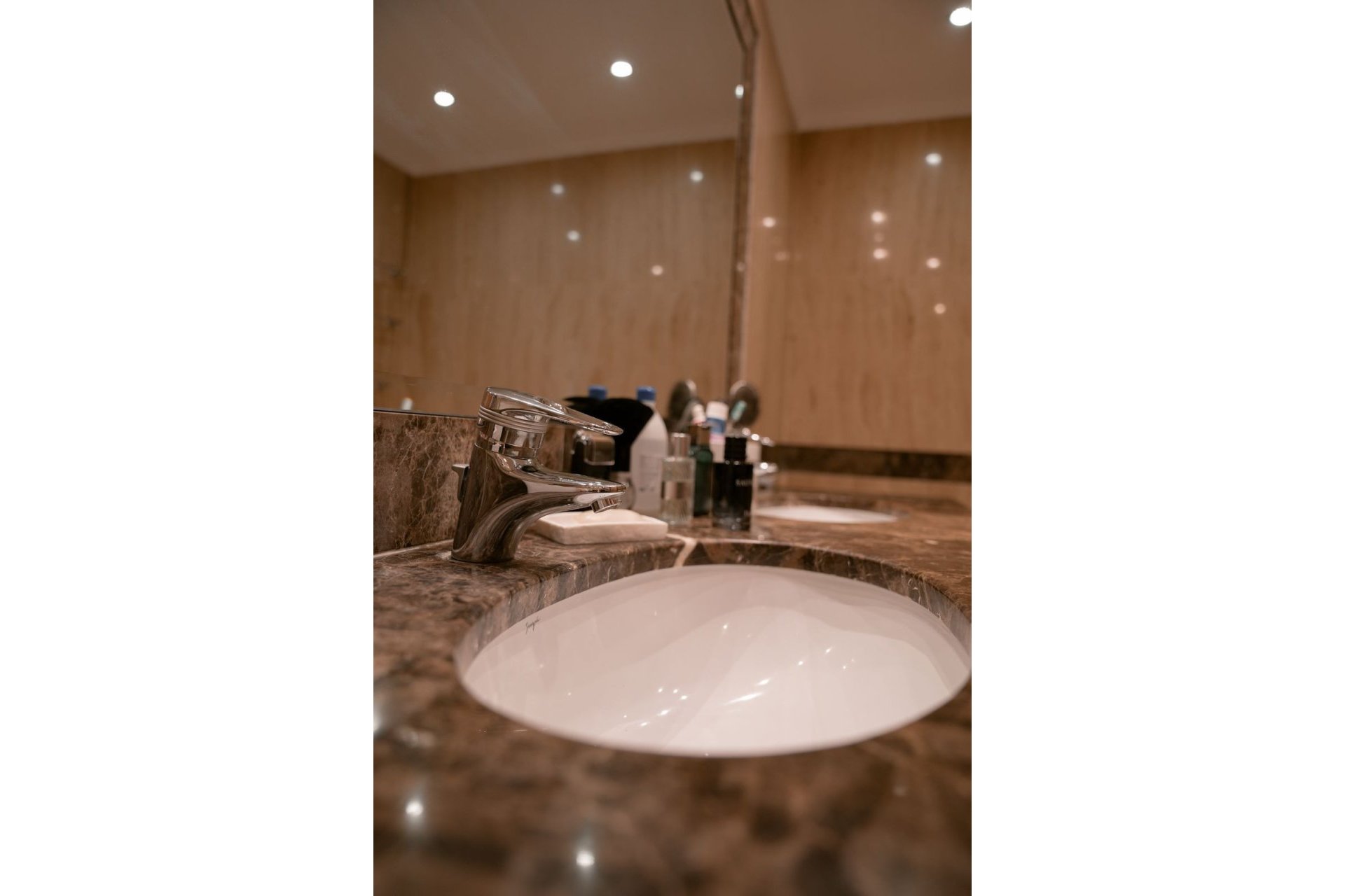 The complex offers exclusive amenities such as an indoor and outdoor pool, a modern gym, a spa with a sauna and hydrotherapy, a restaurant, a bar, and 24-hour security.