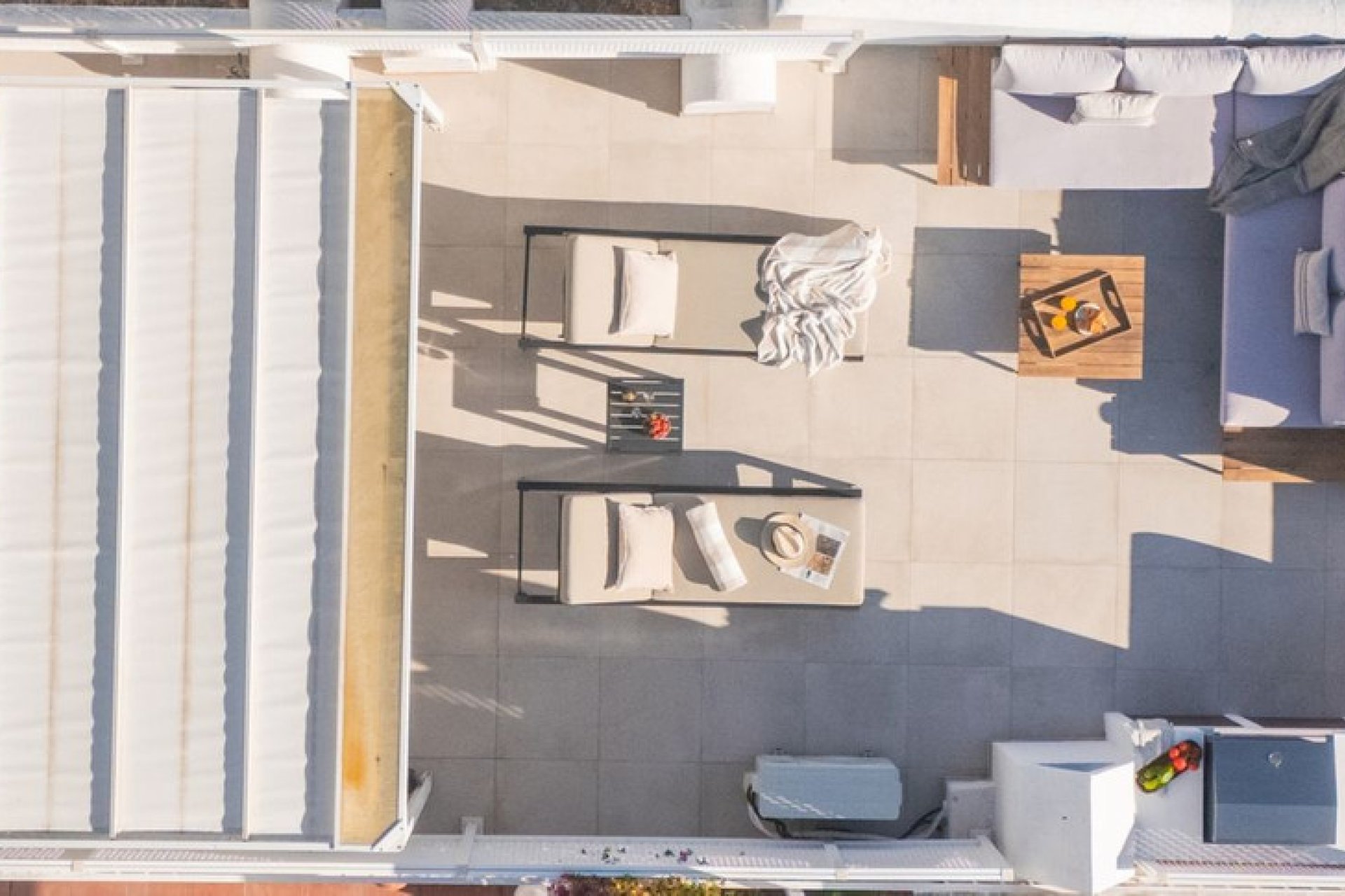 Spanning three levels, the residence features multiple inviting outdoor areas designed for both relaxation and entertainment. A terrace on the main floor is ideal for enjoying coffee at sunrise or dining al fresco with panoramic vistas. The expansive rooftop terrace offers a private sunbathing oasis or the ultimate setting for evening gatherings beneath the Mediterranean sky.