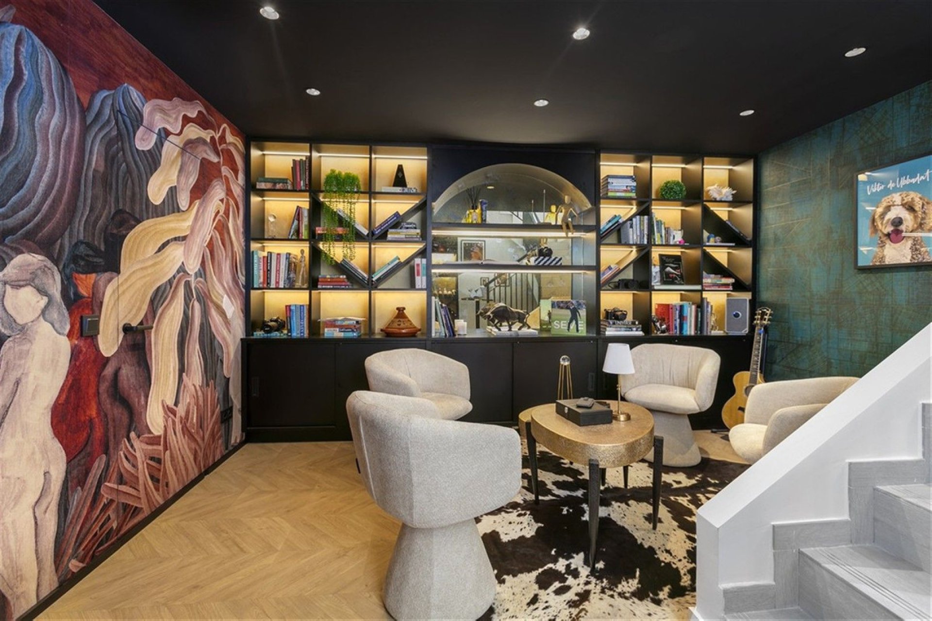 The lower level boasts a luxurious lounge, featuring designer shelving, custom lighting, and statement décor. Chic and intimate, it's the perfect space for relaxation or entertaining.