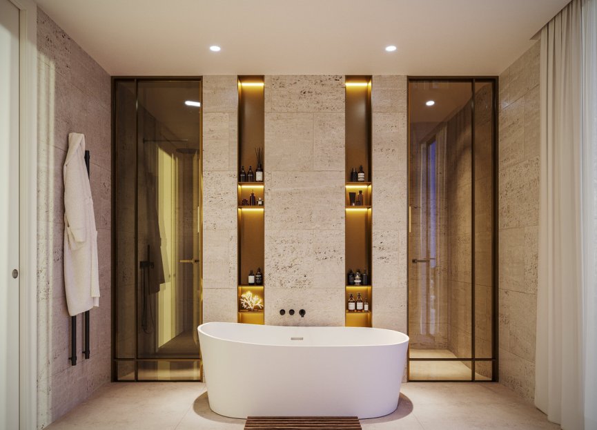 • Throughout the house, except bedrooms, large-format, top-quality rectified porcelain stoneware flooring with matching skirting boards. In bathrooms and toilets, top-quality rectified porcelain stoneware flooring.